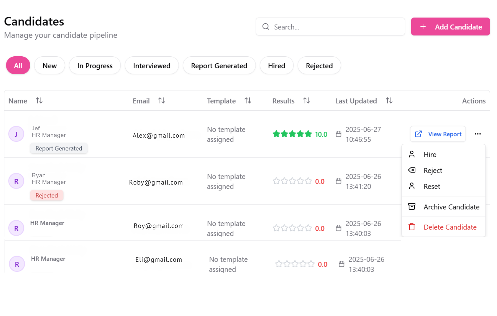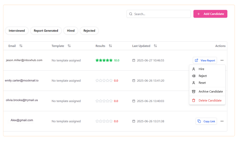 From recorded interviews to detailed candidate insights, get AI-generated reports with scores, smart tags, and full candidate profiles – all in one place, quickly, clearly, and without any extra work.